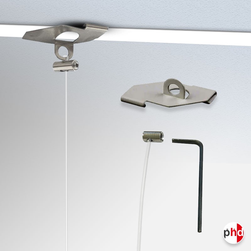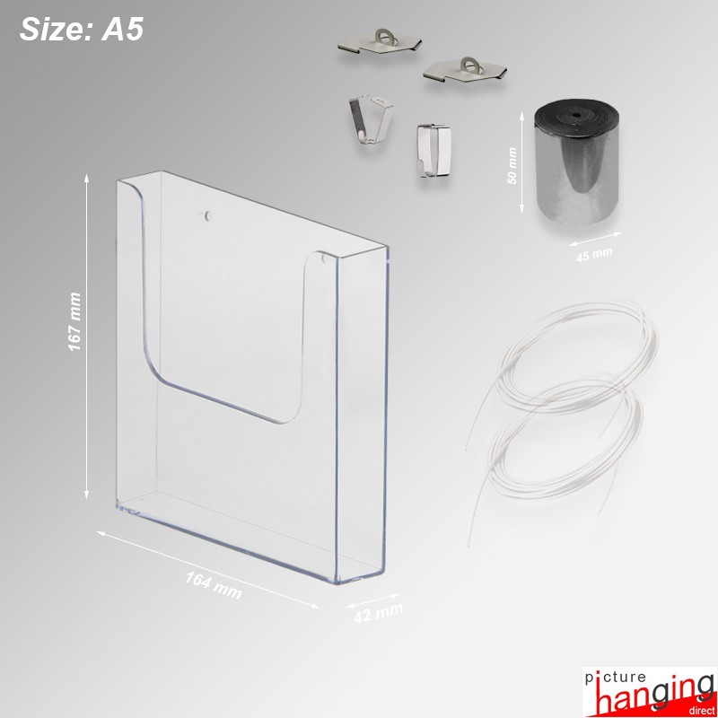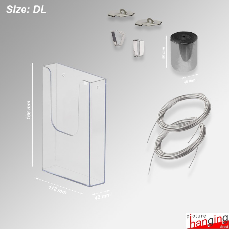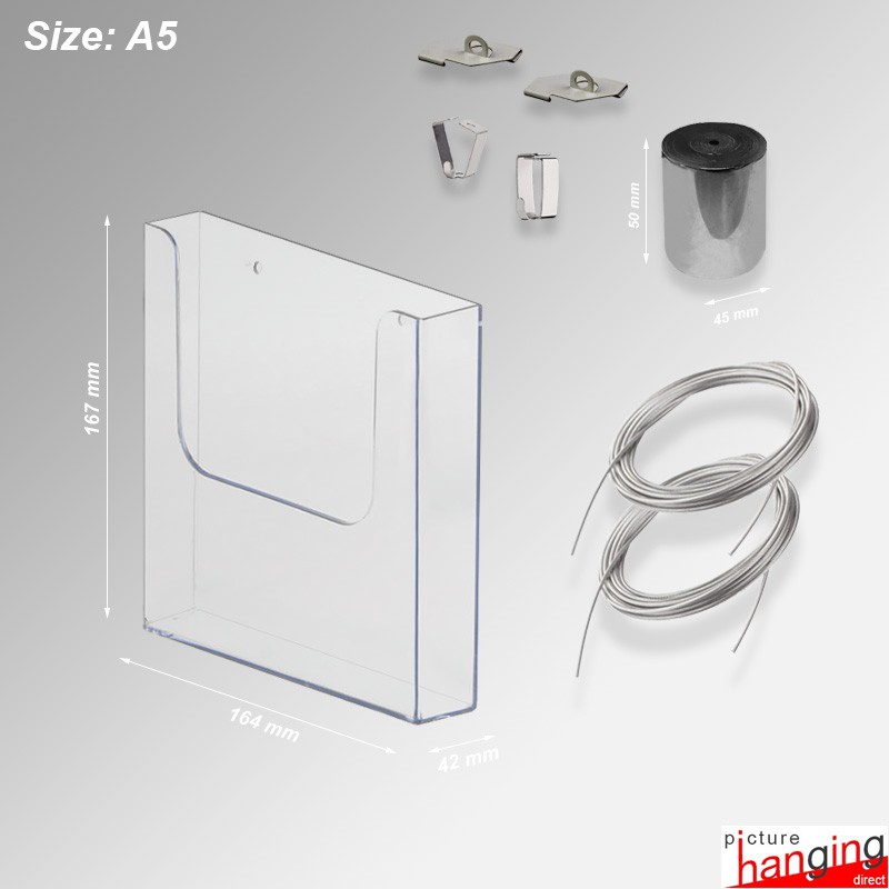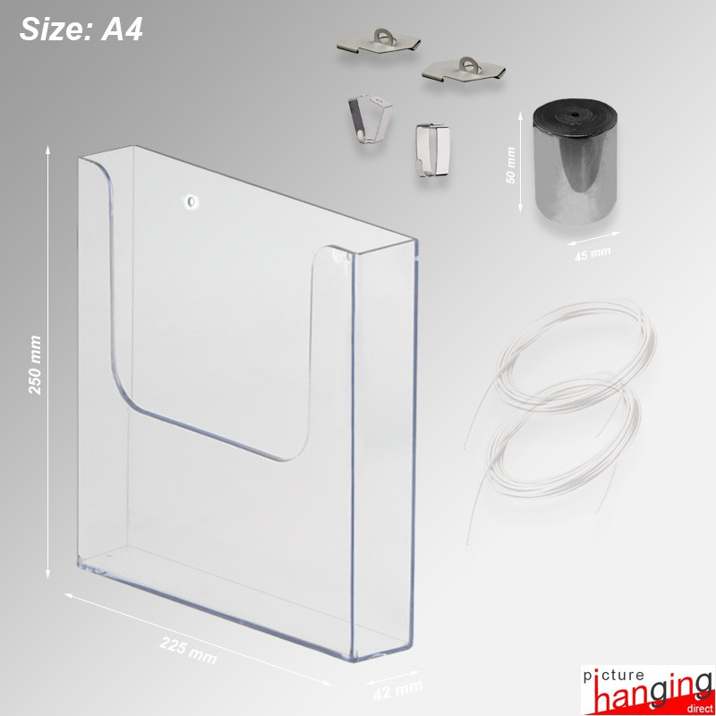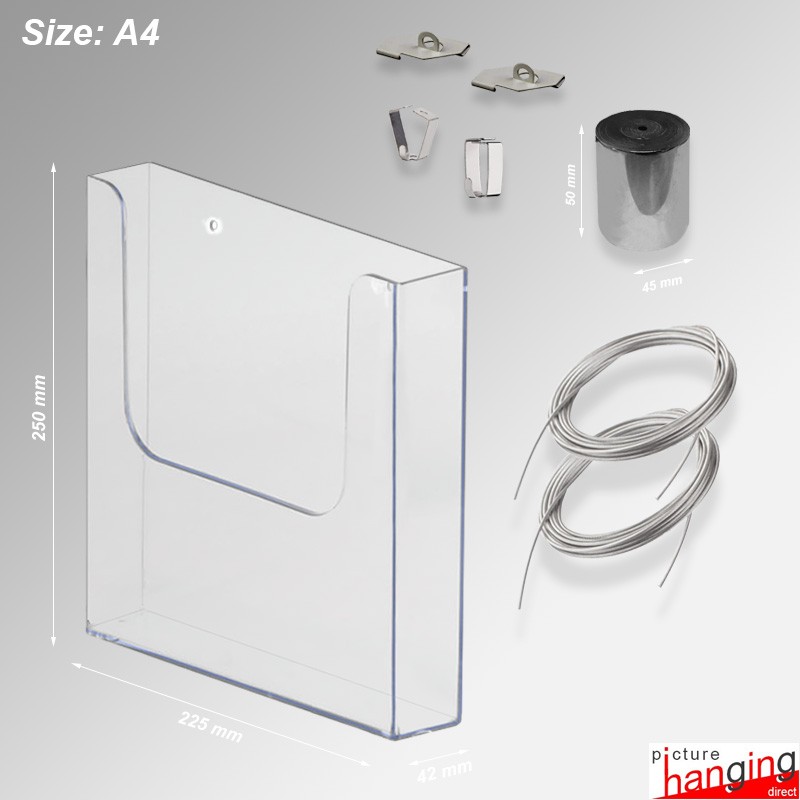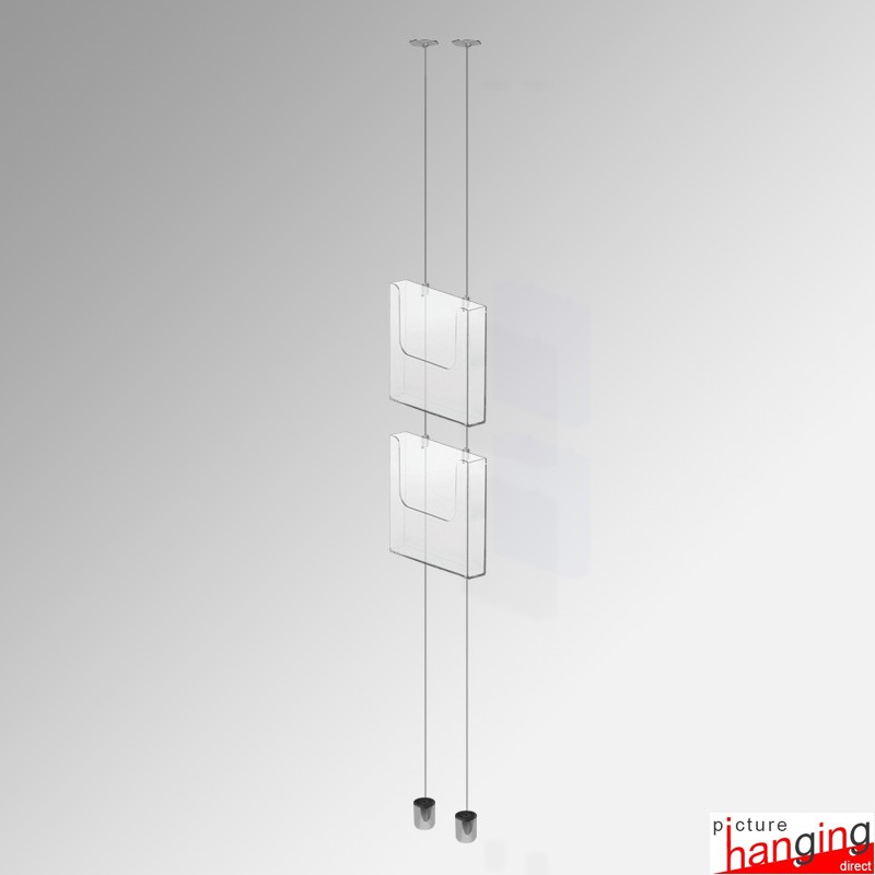 The Ceiling-to-Floor Grid Clip Brochure Holder Set hangs leaflet dispensers from ceiling grids, using twist-on clips & weighted cables! A system requiring no screws or drilling! Twist-on clips attach directly to the ceiling grid, and their wires suspend up to (4) brochure holders! Sets feature (2) Twist-On Clips, (2) 4m cables & (Up to 4) PVC Holders, sizes: DL, A5 & A4 (160 sheet cap.).
