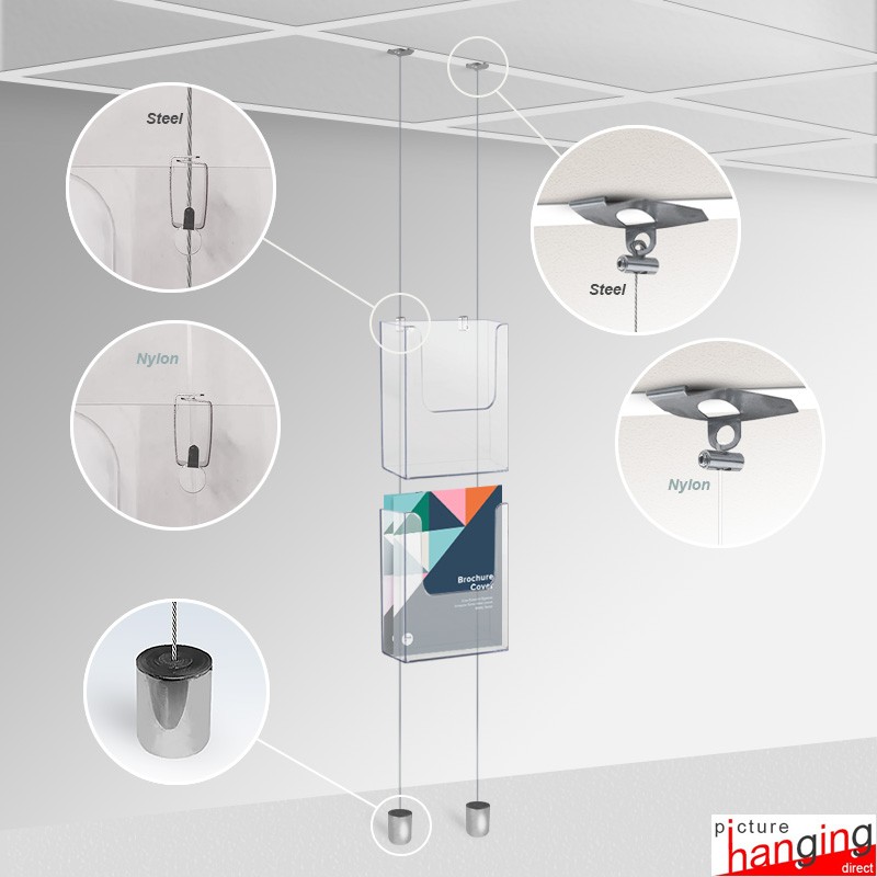 Whether you're brightening up real estate offices, enhancing retail showrooms, or adding a touch of professionalism to waiting rooms and reception areas, these brochure holders suspended on wires elevate your presentations effortlessly. Ideal for both temporary setups and long-term displays, this set of fittings can create wall & window leaflet displays with ease! Each Ceiling-to-Floor Grid Clip Brochure Holder Set has the option for steel cable or "clear" transparent nylon cords to suspend your brochure display, to transform your space and make your information easily accessible and visually appealing with this sleek and practical display solution! Uninstalling the display entirely does not cause any damage to your ceiling or floor!