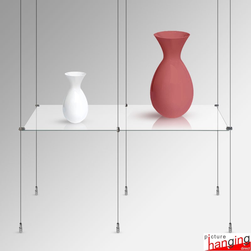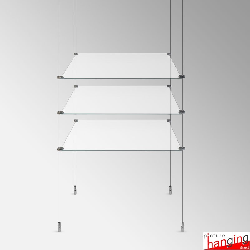 Suspended Glass Shelf Units feature glass shelving boards and all the necessary suspension wires & fittings to create a shelving system suspended between the ceiling and the floor. Each complete suspended glass shelving unit consists of (4) cable wires with ceiling-to-floor fixings and (4) shelf supports for each shelf.