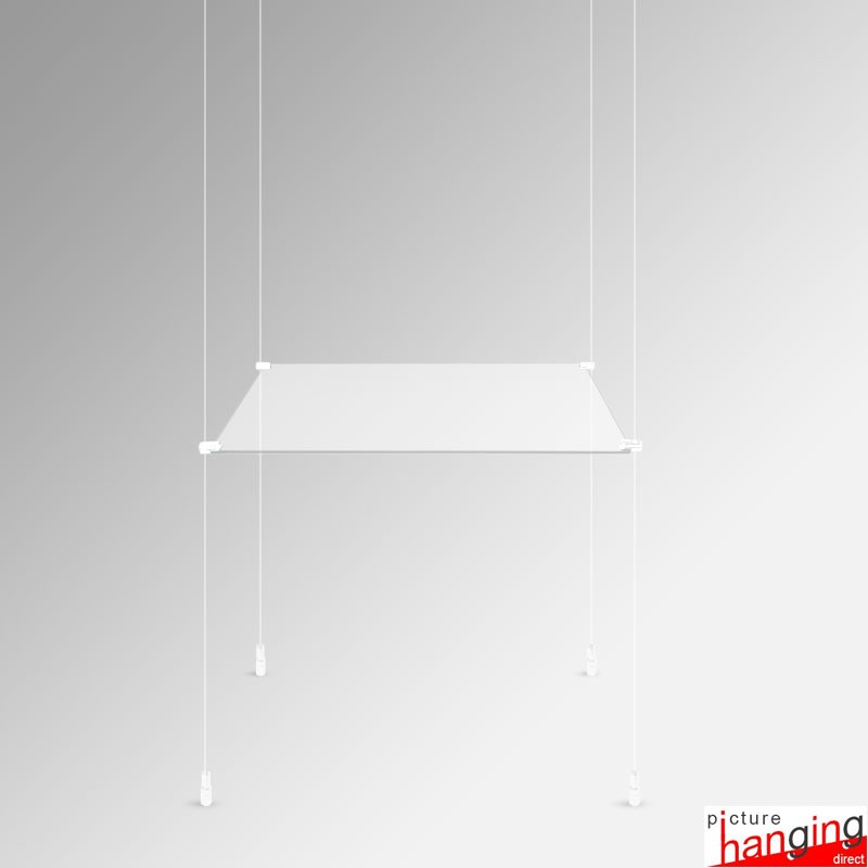 Suspended White Glass Shelf Units feature our exclusive white glass shelving boards and all the necessary suspension wires & fittings (in white) to create a shelving system suspended between the ceiling and the floor. Position a complete shelving unit on your store's shop floor or integrate one into your window display! Each complete suspended glass shelving unit consists of (4) white cable wires with ceiling-to-floor fixings and (4) white shelf supports for each shelf.