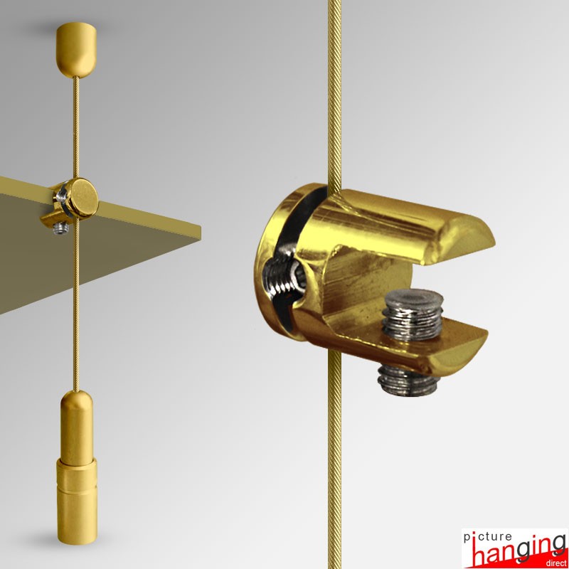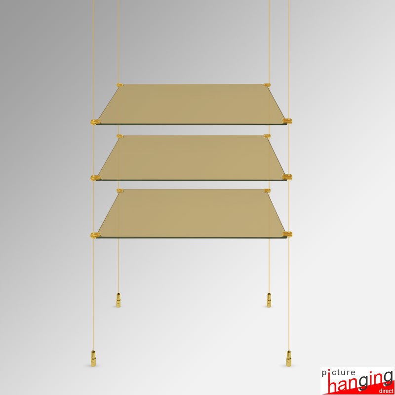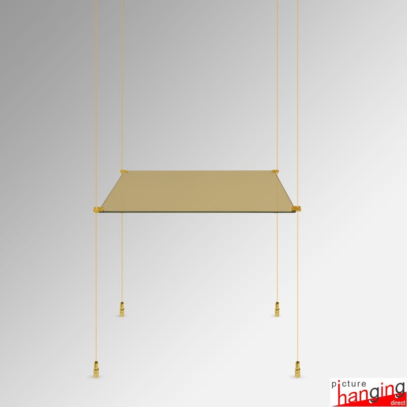 Suspended Gold Glass Shelf Units featuring a complete gold cable system & gold shelves. An all gold colour cable display system to create stunning product shelving for shop and window displays (items viewed from inside & outside your store!) All gold cables, gold fittings & gold glass in various sizes.