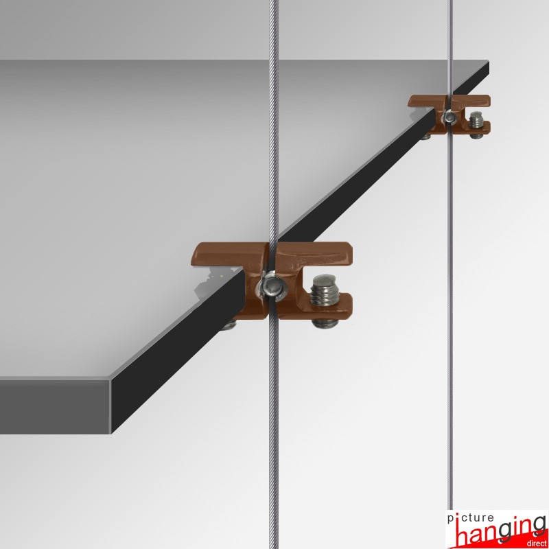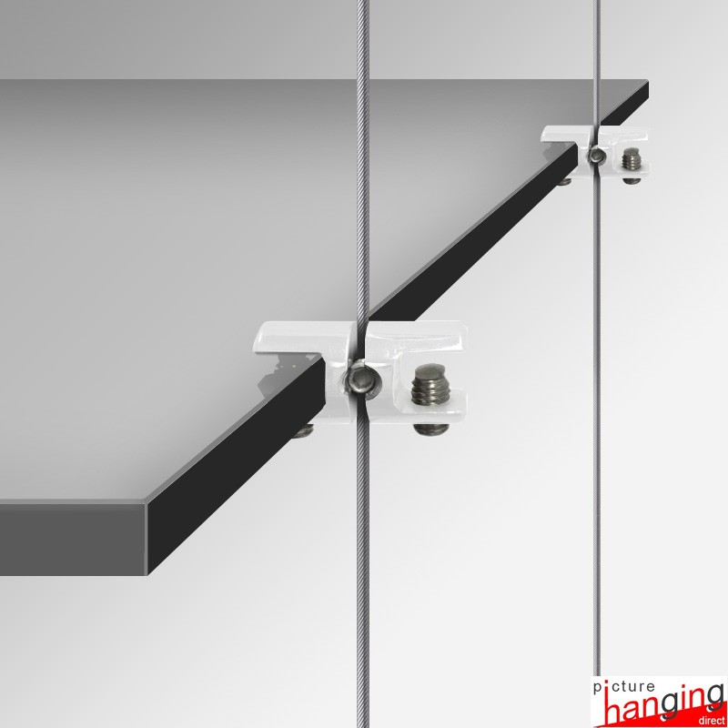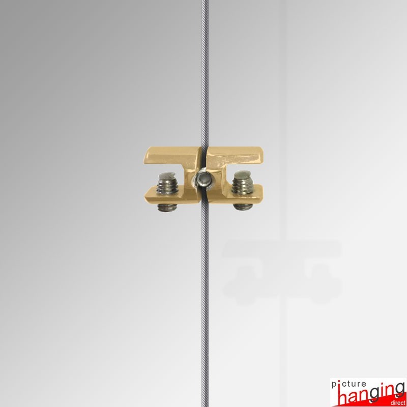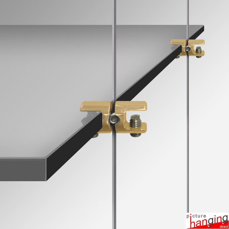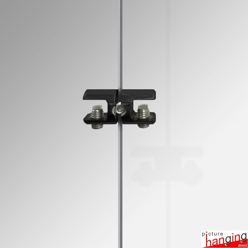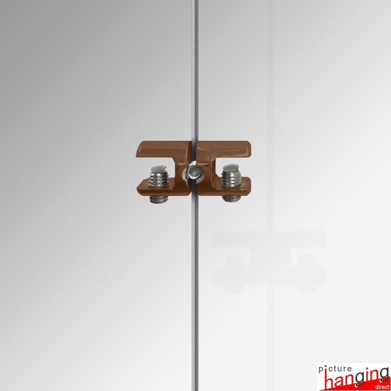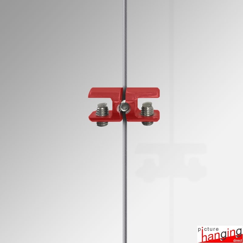 The Shelf Cable Support Double is a high-quality wire clamp designed to attach two glass shelving boards side-by-side, allowing you to extend your adjustable glass shelf display suspended on its Cable Display System (add two additional cables to the edge of your display, and the double-support will attach to the single cable in the middle!). These cable shelving systems enable you to easily add, remove, or adjust each glass shelf at any time. The double shelf support is compatible with steel cable wire up to 2mm in thickness. Please note that one shelf board requires four shelf supports, supported by four suspended cables.