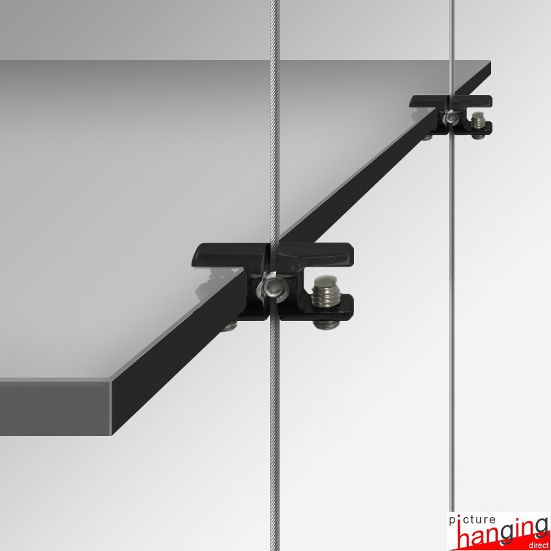 Shelf Cable Support Double is a horizontal grip/clamp to hold two glass shelves on a vertically suspended cable display system. Suitable for shelf boards of 6mm, 8mm & 10mm thickness, mount shelves side-by-side, and extend your shelving unit for an existing retail display. Compatible with up to 2mm steel cable wires. For use with toughened safety glass only!