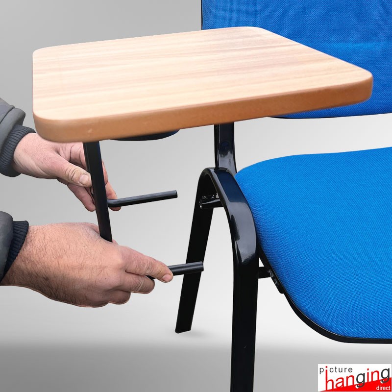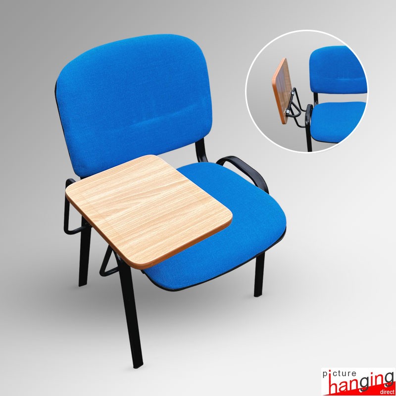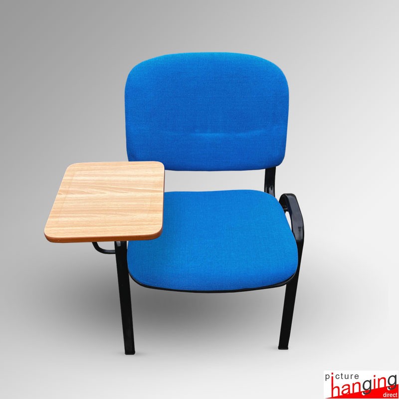Blue Lecture Chair with soft padded seat and writing tablet - ideal for Press conferences & the education sector. Stackable chairs with durable padded fabric seat & backrest and heavy-duty steel frame (supports up to 200kg). A detachable, high-quality folding wooden tablet, comfortable for writing. Padded seat & frame in blue. Tablet in beechwood.
