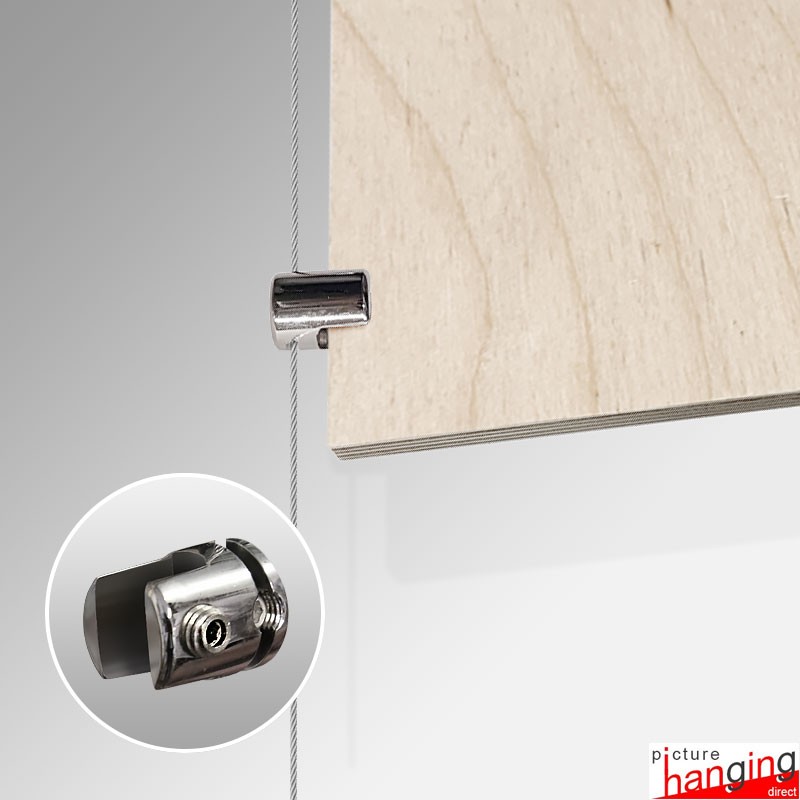Heavy Panel Support Single is a brass cable clamp for attaching panels, mountboards, or perspex to a suspended cable display system - ideally used for retail shop floor & window display signage & advertising. This vertical clamp holds up to 8mm hard materials onto 1.5mm to 3mm suspended cables. Available in a premium polished chrome finish.