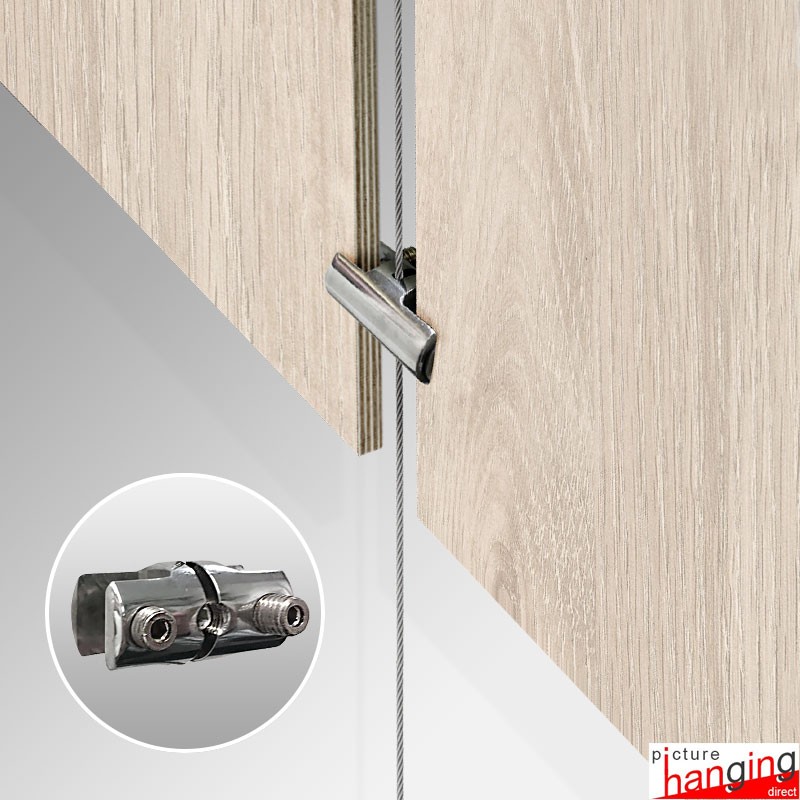Heavy Panel Support Double is a dual-sided cable clamp for attaching 2 panels, mountboards, or perspex (side-by-side) on a suspended cable display system - ideally used for retail shop floor & window display signage & advertising. This vertical clamp holds 6mm, 8mm, & 10mm hard materials onto 1.5mm to 3mm suspended cables. Available in a premium polished chrome finish.
