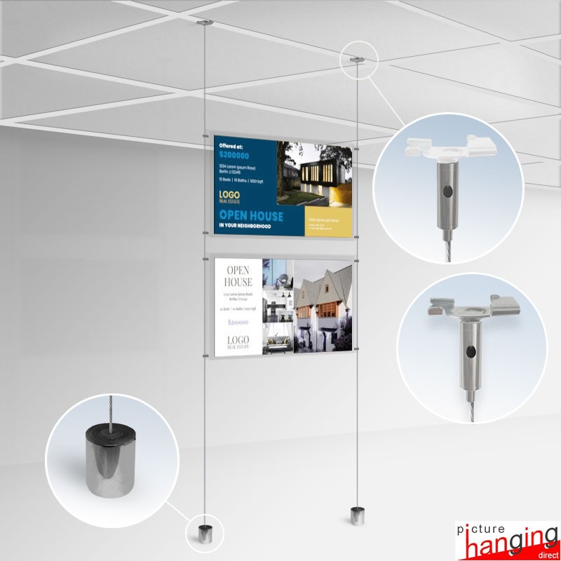 The Suspended Ceiling-to-Floor Twist-On Wire & Weight Set is a ready-to-use cable display fitting for creating window displays in estate agents & retail. A weighted hanging wire between the ceiling & floor, requiring no screws for installation! Twist-on clips with wires attach directly to the ceiling grid to suspend cables for Poster Panels! Cables are supported on the floor using a weight!