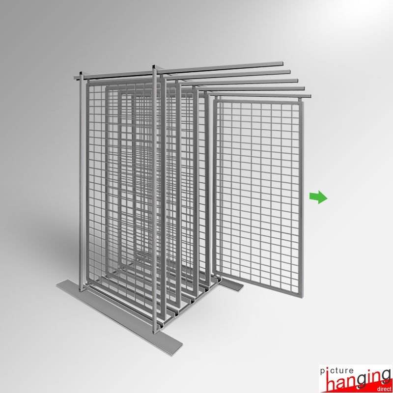 Pull-Out Art Storage & Display Stand is a unique freestanding storage solution for framed paintings. Ideal art racking for galleries & art dealers, designed for browsing & storage. The space-saving design uses sliding grid panels on glide rails to hang multiple frames. Panels slot & move effortlessly and require no tools to set up & use!