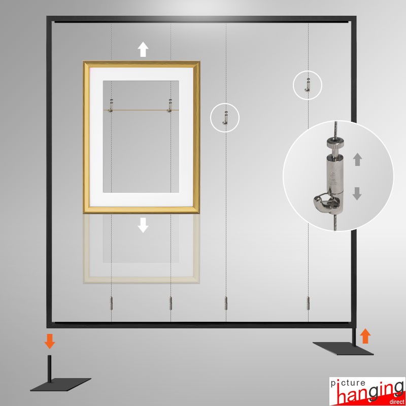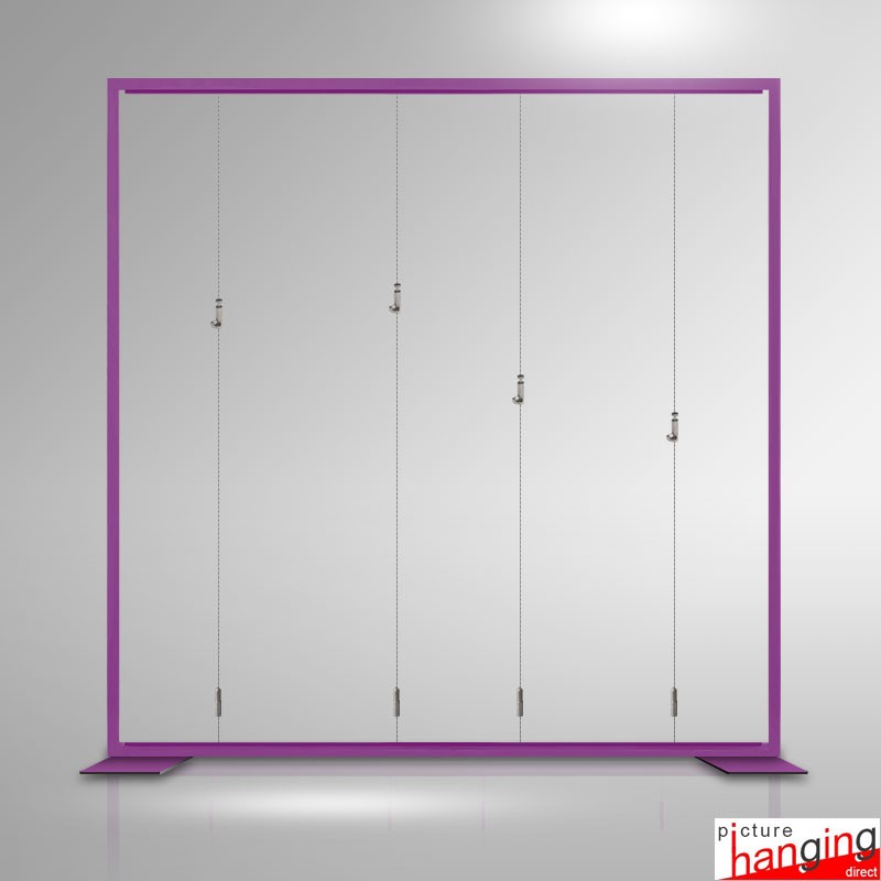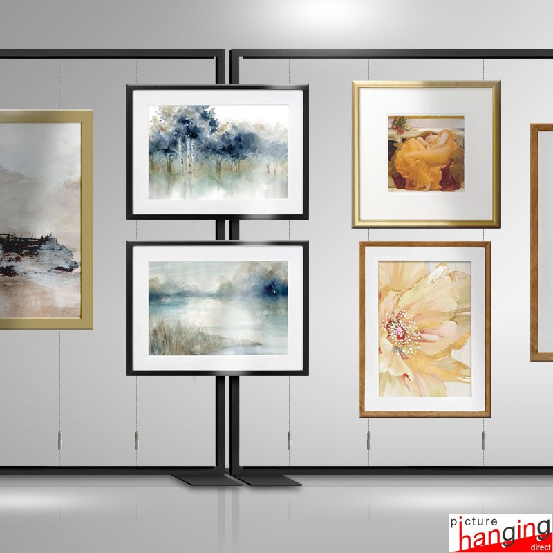 Introducing our Freestanding Picture Hanging Partition, the ultimate solution for showcasing art in listed buildings and perfect for installation against glass walls or expansive department store and shopfront windows! This innovative stand features robust steel cables cleverly integrated within a sleek 2x2m frame, enabling you to hang pictures of all sizes and positions with ease.