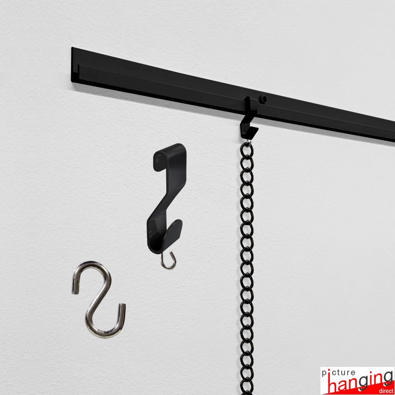 A simple frame-hanging method in which you attach the S-hook anchor onto the J-shaped picture rail (included) and suspend the steel picture hanging chains from it! Attach your picture frames and canvases to the chains using the picture chain s-hooks. You can hang artwork at any point on the chain, regardless of its size!