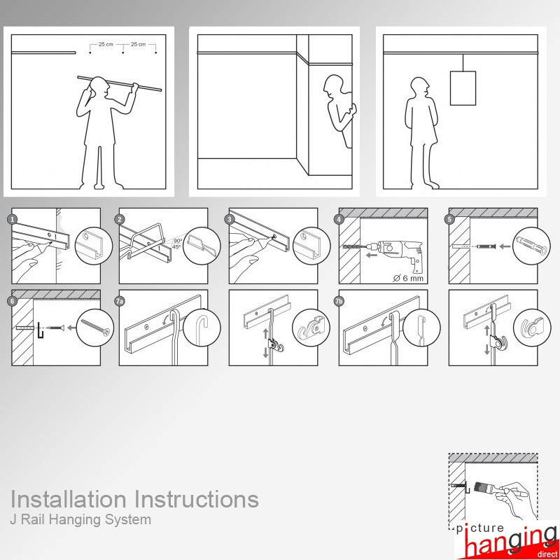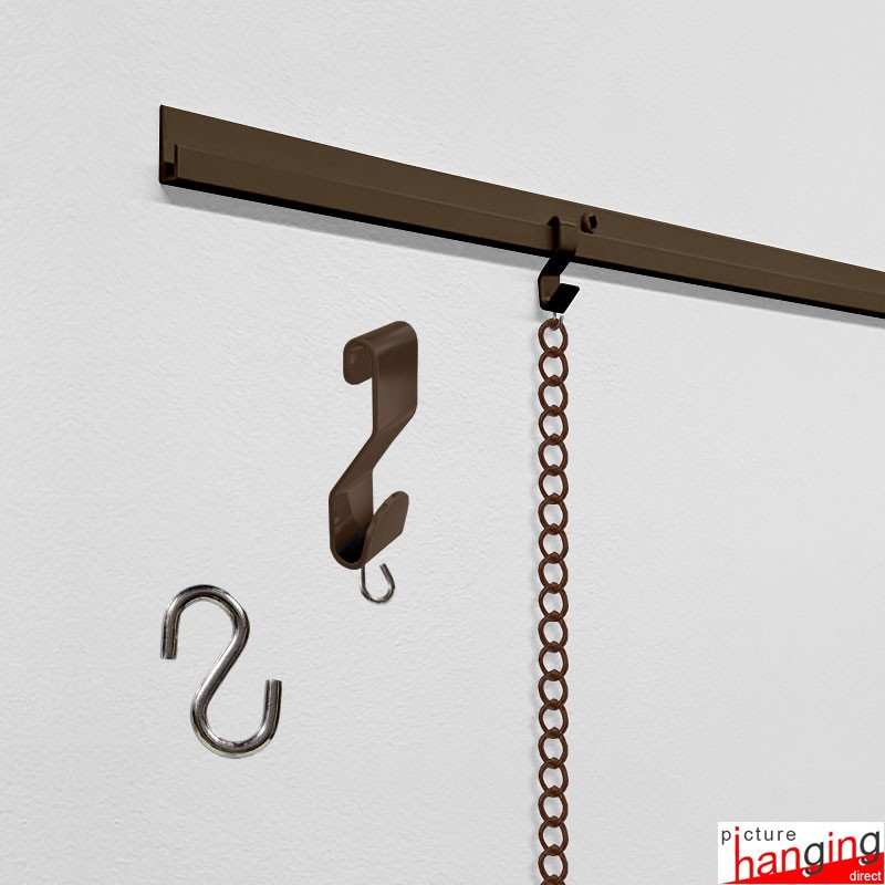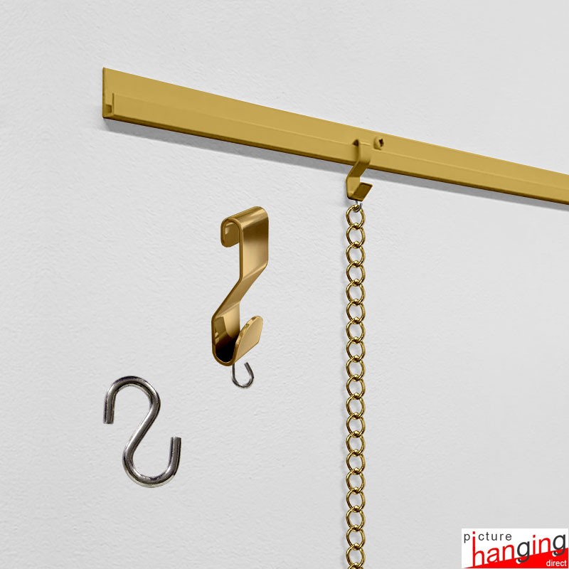 The J Rail Picture Chain System features a heavy-duty picture rail with traditional hanging chains (instead of steel cables) to hang your paintings. This strong frame hanging kit includes a J-rail gallery rail (2m or 3m), steel picture chains (1.5m), S-hook anchors & picture chain s-hooks. Picture rail & chain colours: White, Silver, Black, Gold & Brown. Custom colours & chain lengths available.