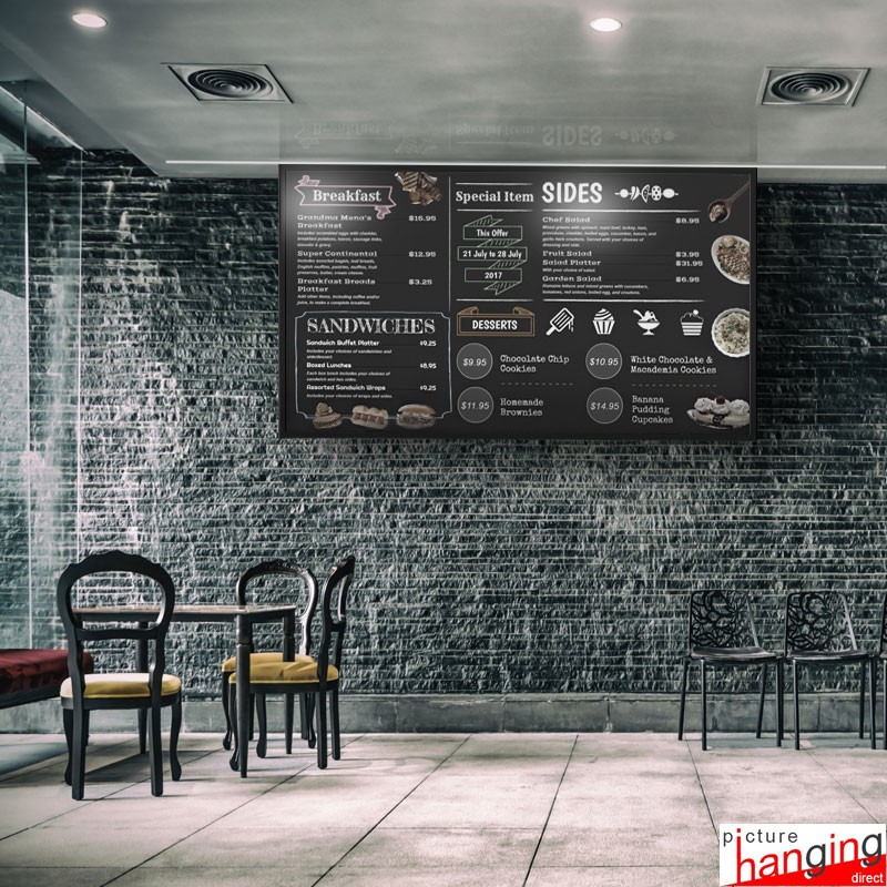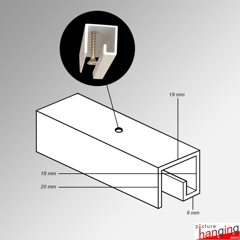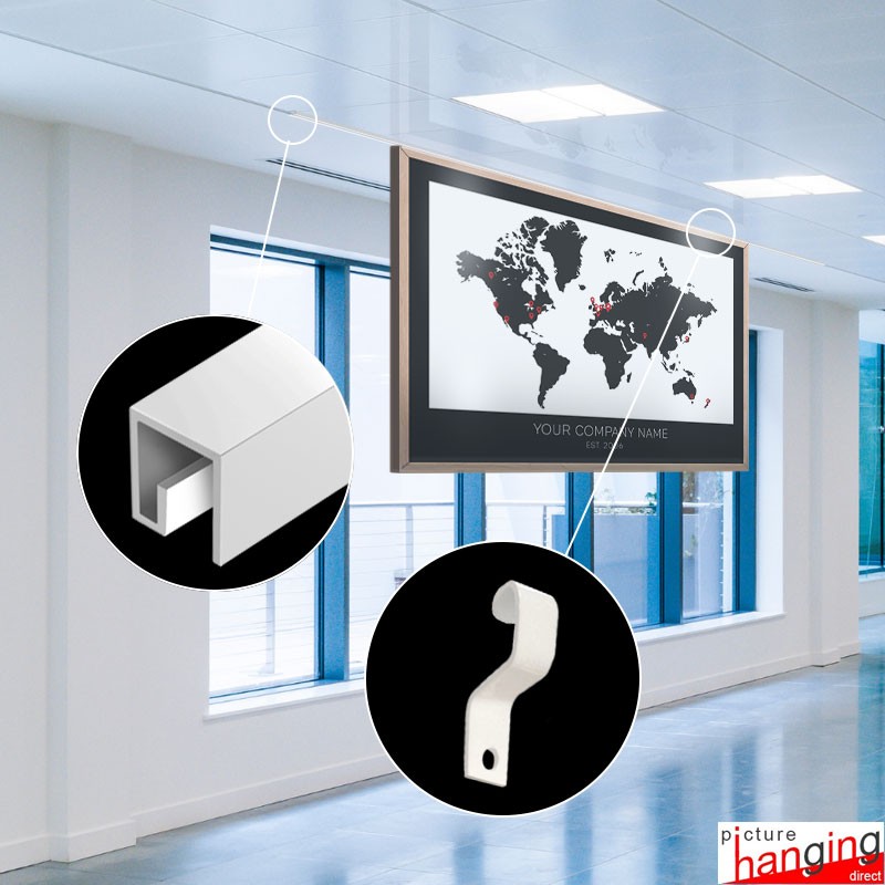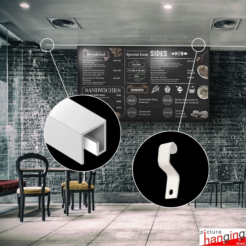 The Window Ceiling Board Hanging Set creates versatile window displays and signage placement above open areas. It utilises a P-rail ceiling system, which is an effective solution for users who prefer not to attach items directly to walls or utilise wall-mounted picture rails. This system is quick and easy to hang various items, including paintings, canvases, signage, noticeboards, and food menus. Once hung, boards can be effortlessly repositioned along the rail from left to right without the need for additional tools or unscrewing. To install, screw the provided "s-hook" hangers into the back of any panel, frame, or board, and then attach them to the ceiling-mounted P-rail gallery system. This setup offers both flexibility and convenience for your display needs. - Heavy-duty P-rail track has a weight capacity of 40kg per meter (on strong ceilings!)