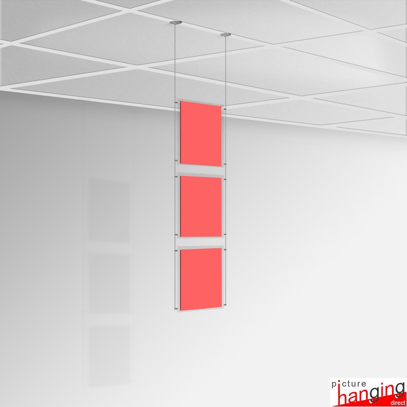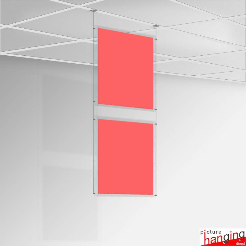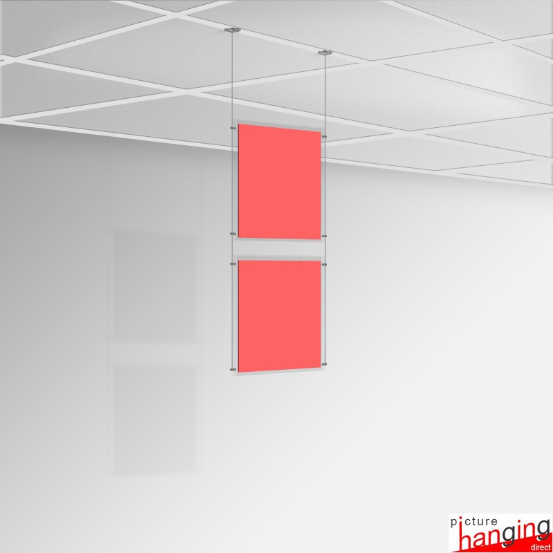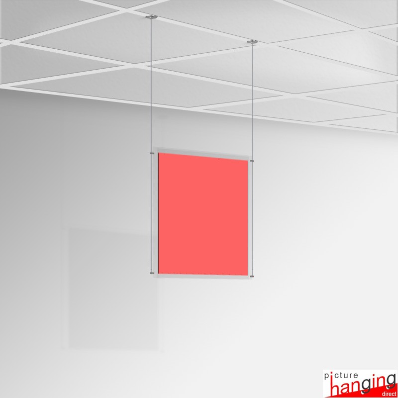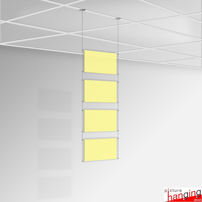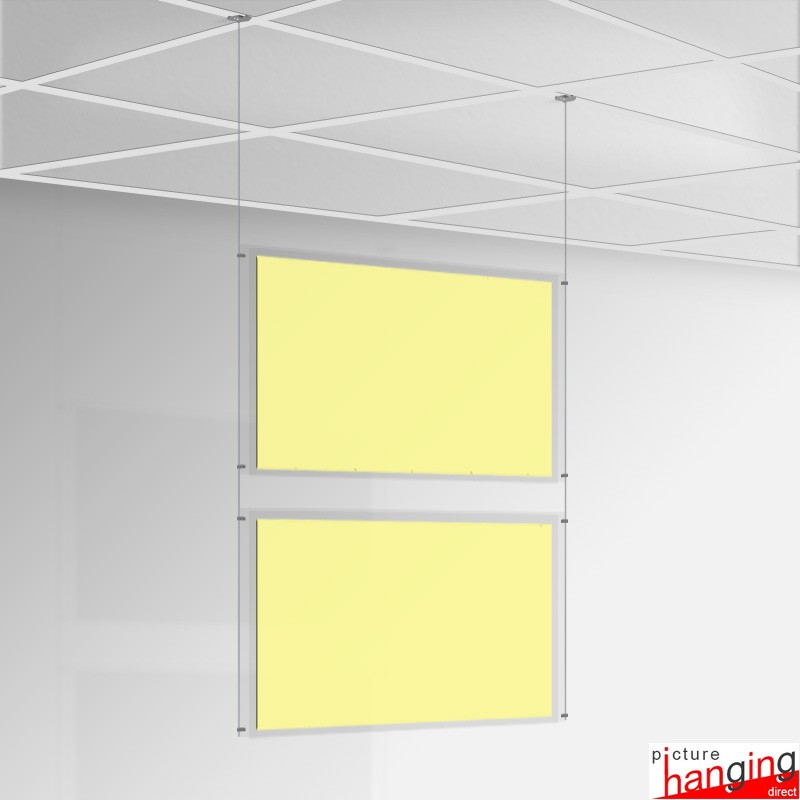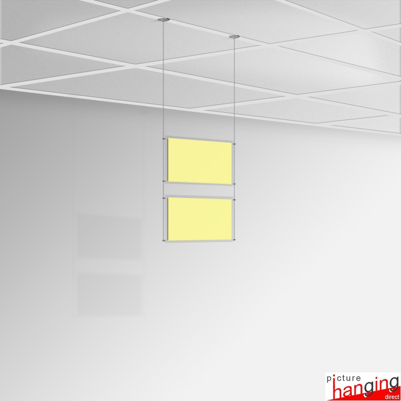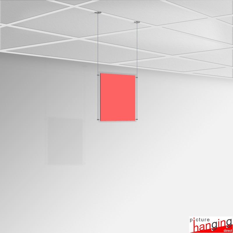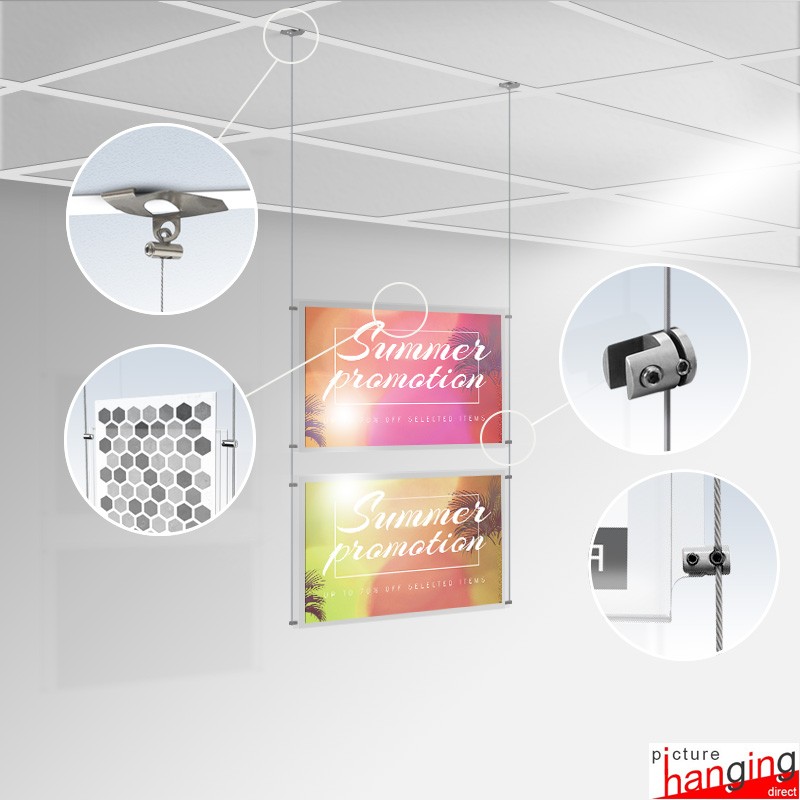 The Ceiling Grid Hanger Set is a ready-to-use kit of hanging fittings to hang signs from suspended ceilings! A unique hanging system requiring no screws or drilling! Twist-on clips attach directly to the ceiling grid, and their wires suspend an acrylic pocket that holds your POS sign. Sets feature (2) Twist-On Clips, (2) 2m cables & (Up to 4) poster pockets, sizes: A4 to A0 (Portrait & Landscape)
