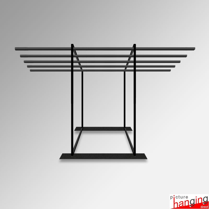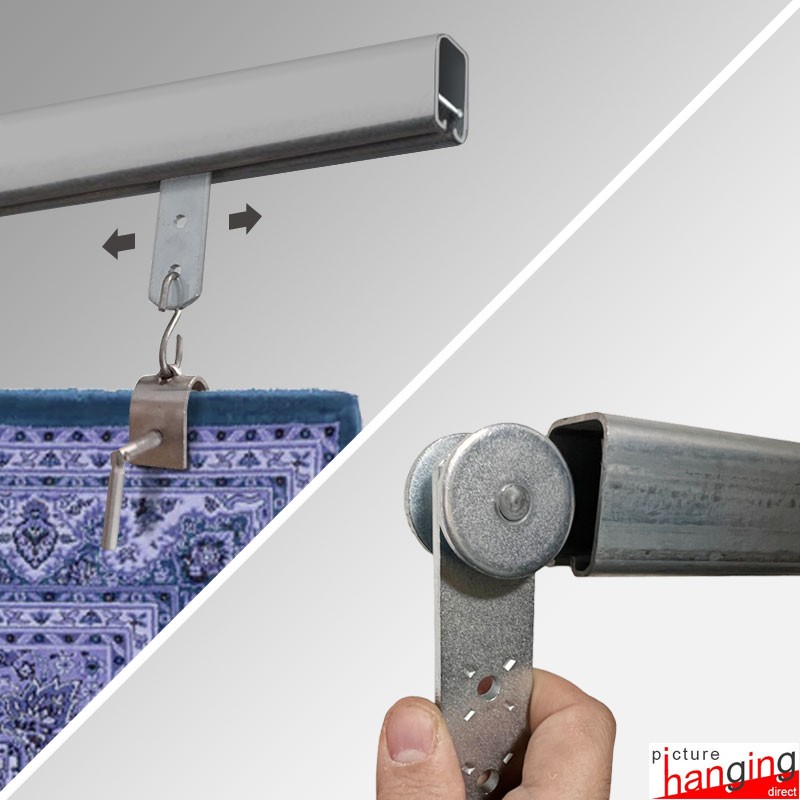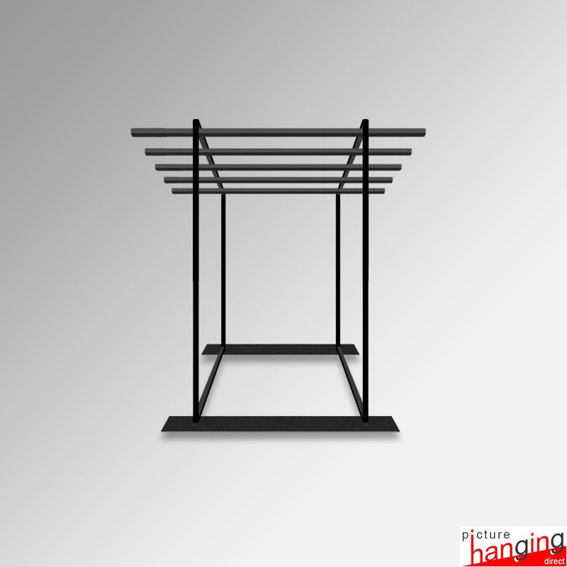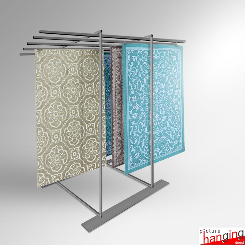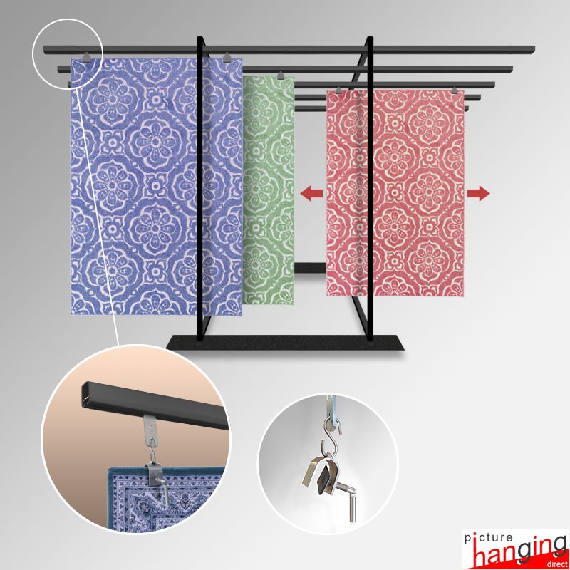 Exhibition Carpet Rack Display Stand is a freestanding rug & tapestry browser for events in galleries, retail spaces, and carpet markets. An efficient space-saving design with effortless browsing, this display stand utilises mounted rails & sliding hangers to present multiple rugs in their entirety! Requires no tools for assembly!