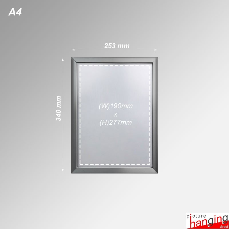 Each aluminium snap frame features a front-opening design, allowing you to quickly and easily swap or replace posters. Once mounted, snap the frame closed to secure the poster! Additionally, the snap frames come with an anti-glare PVC cover film that not only provides UV protection but also prevents colour fading & bleaching in direct sunlight. Choose from a range of snap frame sizes: A4, A3, A2, A1, and A0.
