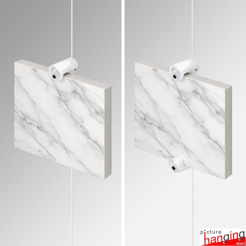 The White Top/Bottom Panel Support is constructed from brass and available in a premium white-coated finish or various other colours including gold, silver & polished chrome! Attaching white supports to white-coated suspended cables creates professional displays with vertical arrangement of boards and tiles in columns, which can be presented from exhibition panels, wooden picture rails, gallery systems, or directly from ceilings.